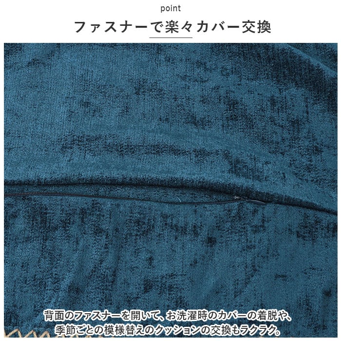 ・背面のファスナーを開いて、お洗濯時のカバーの着脱や、季節ごとの模様替えのクッションの交換もラクラク。