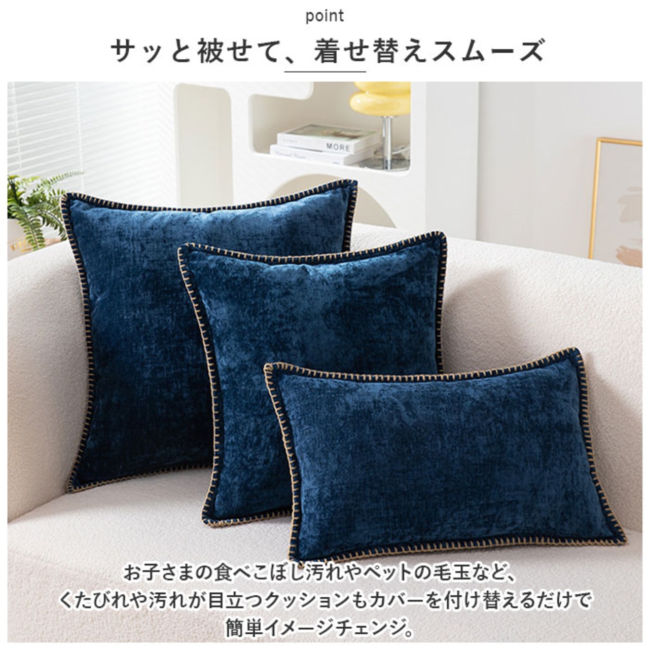 ・お子さまの食べこぼし汚れやペットの毛玉など、くたびれや汚れが目立つクッションもカバーを付け替えるだけで簡単イメージチェンジ。