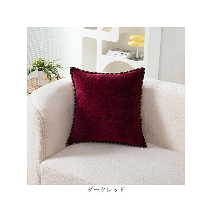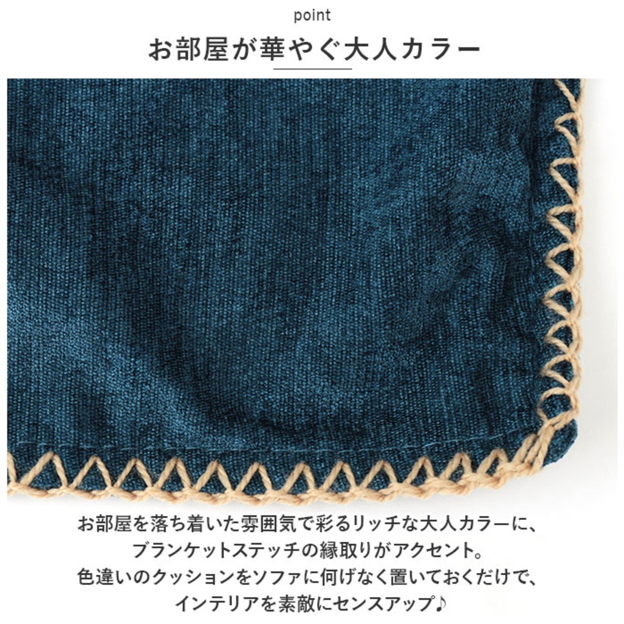 ・お部屋を落ち着いた雰囲気で彩るリッチな大人カラーに、ブランケットステッチの縁取りがアクセント。色違いのクッションをソファに何げなく置いておくだけで、インテリアを素敵にセンスアップ♪