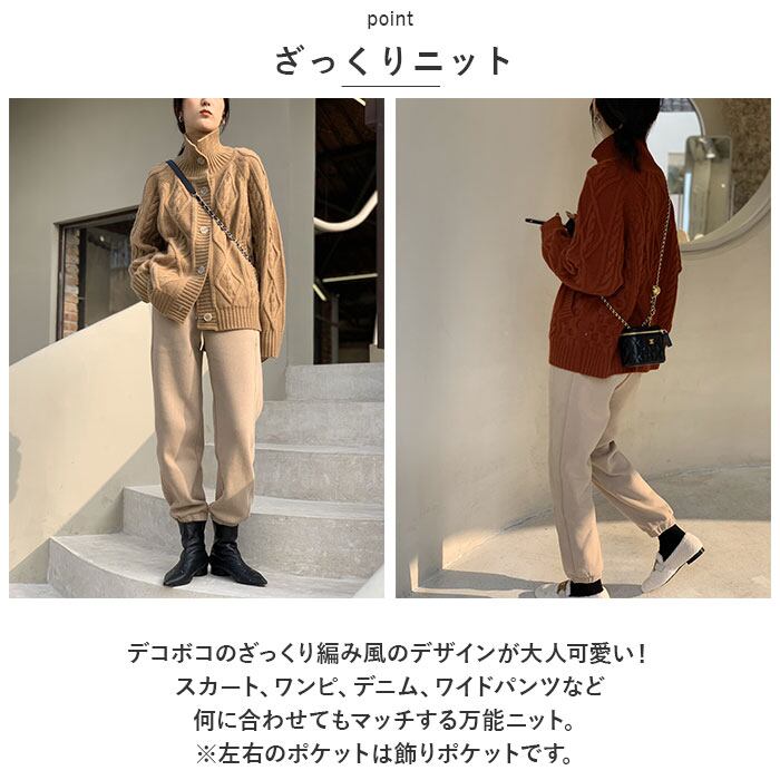 ・デコボコのざっくり編み風のデザインが大人可愛い!スカート、ワンピ、デニム、ワイドパンツなど。何に合わせてもマッチする万能ニット。(※左右のポケットは飾りポケットです。)