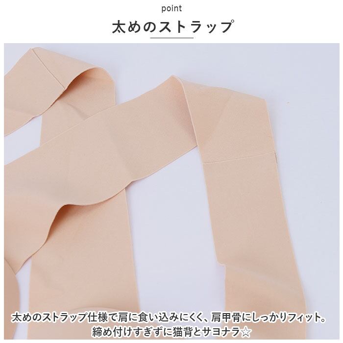 ・太めのストラップ仕様で肩に食い込みにくく、肩甲骨にしっかりフィット。締め付けすぎずに猫背とサヨナラ☆