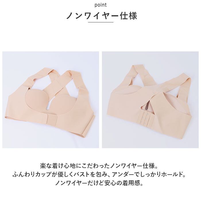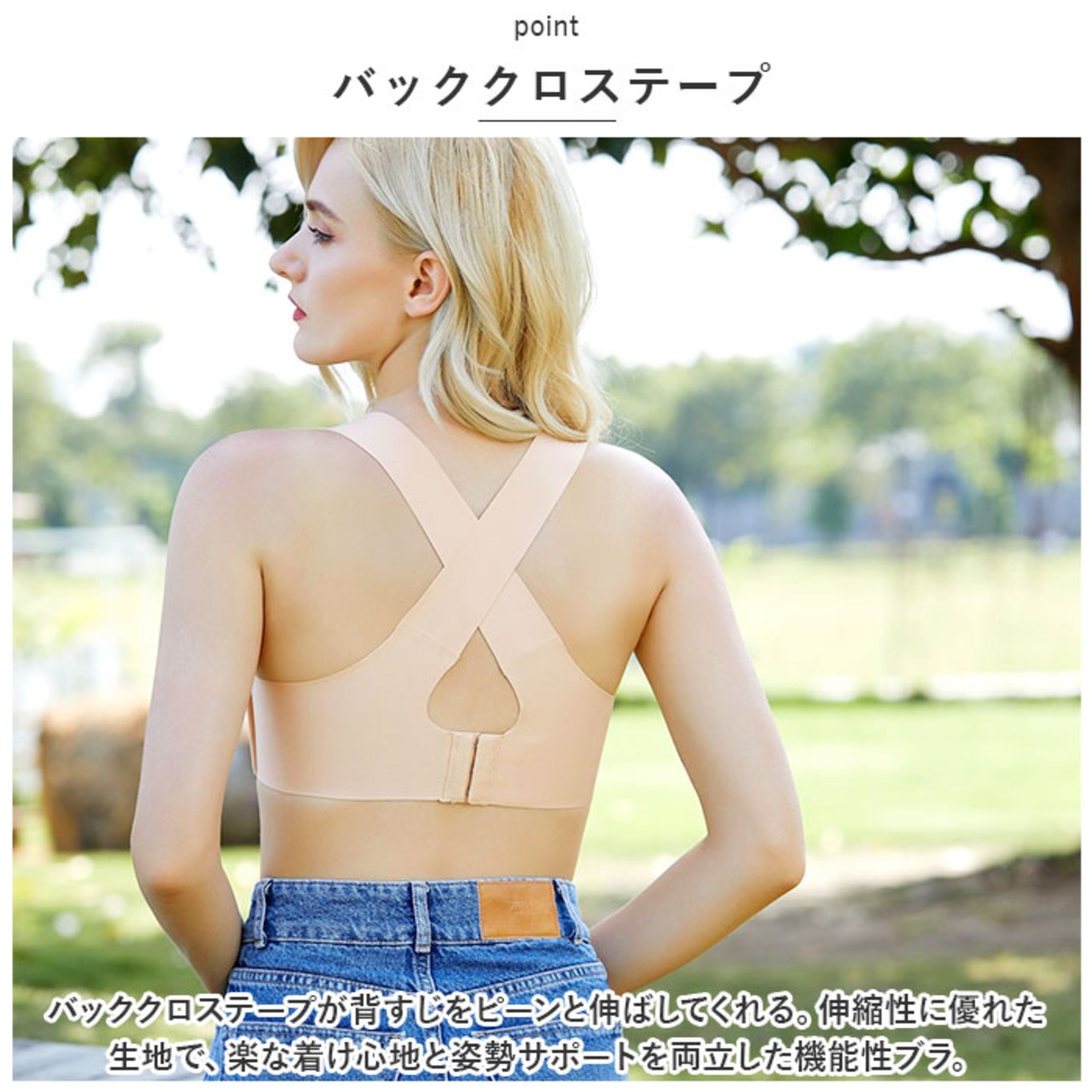 ・バッククロステープが背すじをピーンと伸ばしてくれる。伸縮性に優れた生地で、楽な着け心地と姿勢サポートを両立した機能性ブラ。
