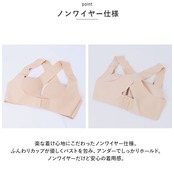 ・楽な着け心地にこだわったノンワイヤー仕様。ふんわりカップが優しくバストを包み、アンダーでしっかりホールド。ノンワイヤーだけど安心の着用感。