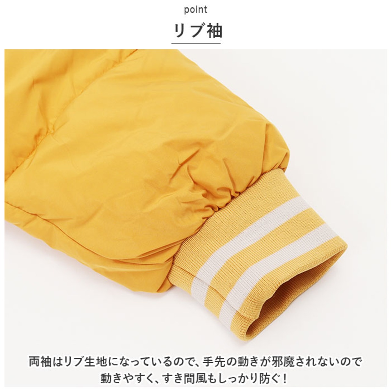 ・両袖はリブ生地になっているので、手先の動きが邪魔されないので動きやすく、すき間風もしっかり防ぐ!