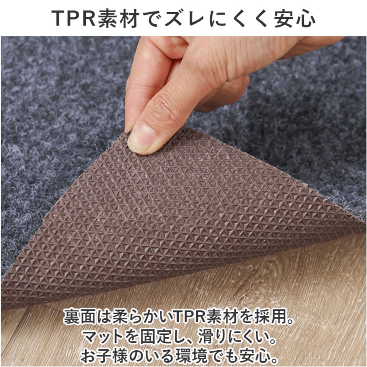 ・裏面は柔らかいTPR素材を採用。マットを固定し、滑りにくい。お子様のいる環境でも安心。
