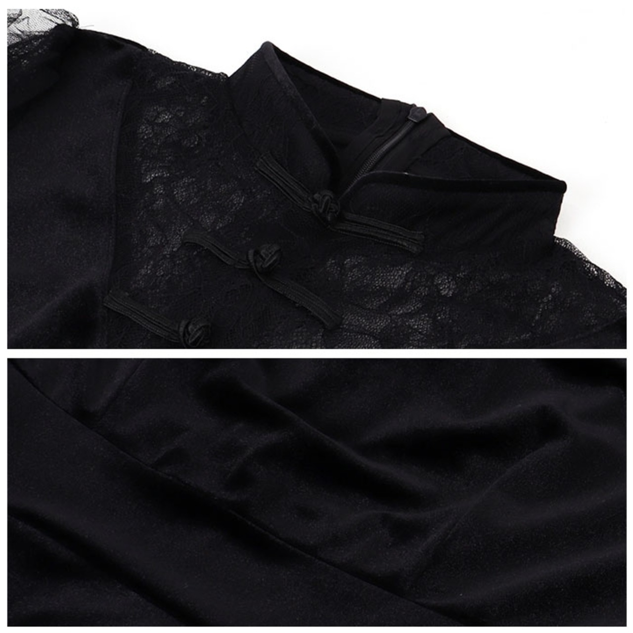 ・胸元のチャイナボタンがアクセント☆袖と胸元に花柄のレースデザインを施し、シンプルながらに上品な雰囲気に。