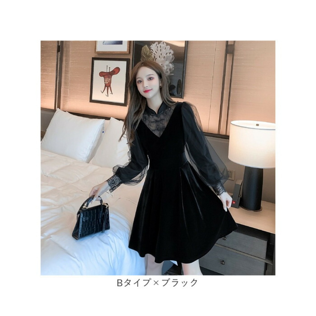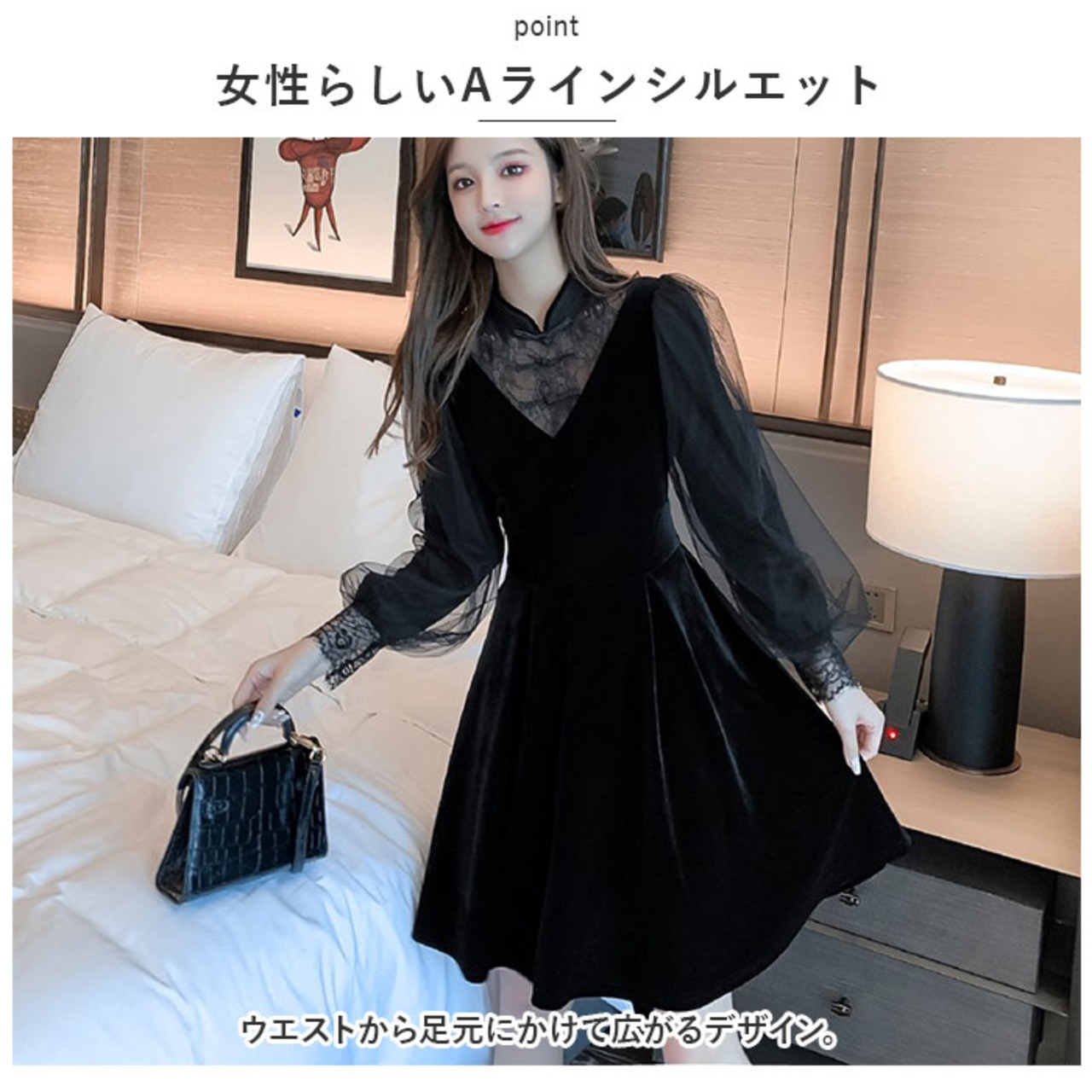・胸元と腕の部分のシースルーとベロア素材のワンピースは、シンプルだけどちゃんと華やかに仕上げてくれる♪