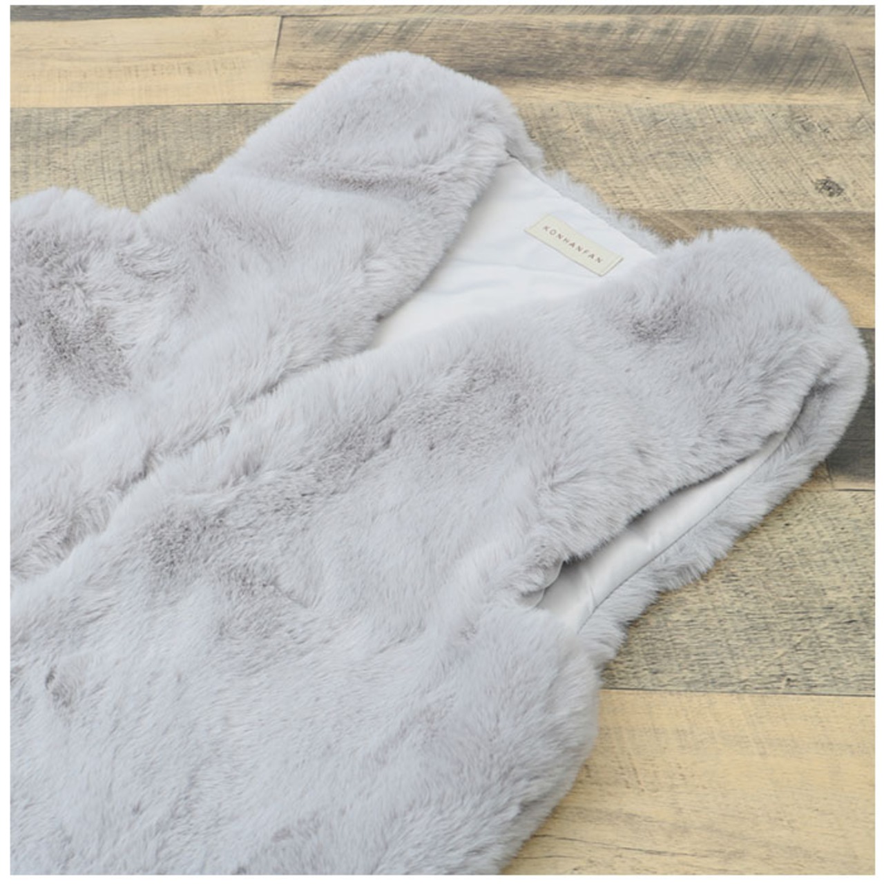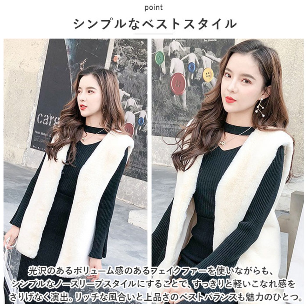 ・ボリューム感のあるフェイクファーを使いながらも、シンプルなノースリーブスタイルにすることで、すっきりと軽いこなれ感をさりげなく演出。リッチな風合いと上品さのベストバランスも魅力のひとつ。