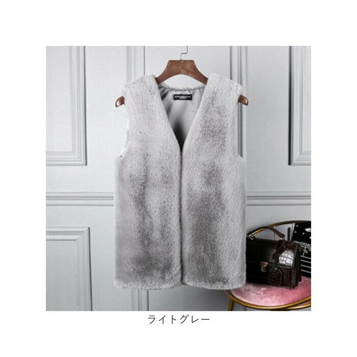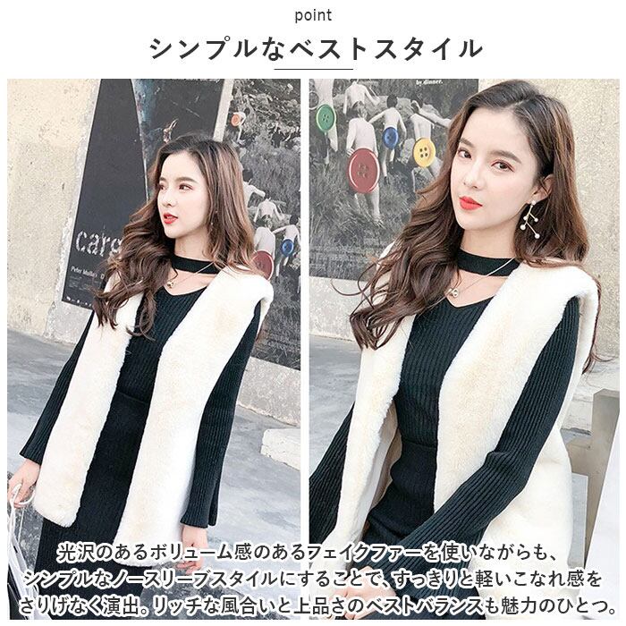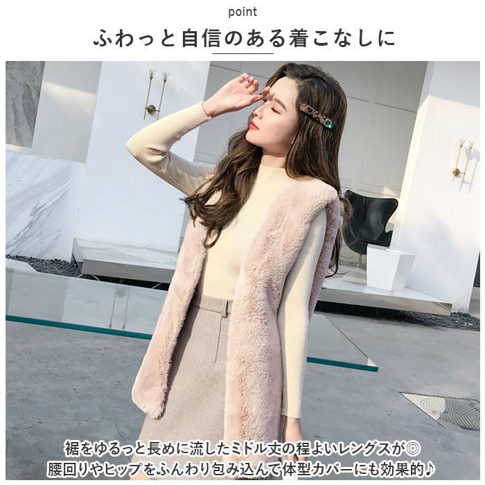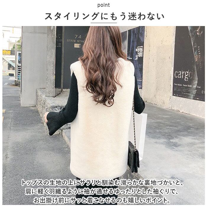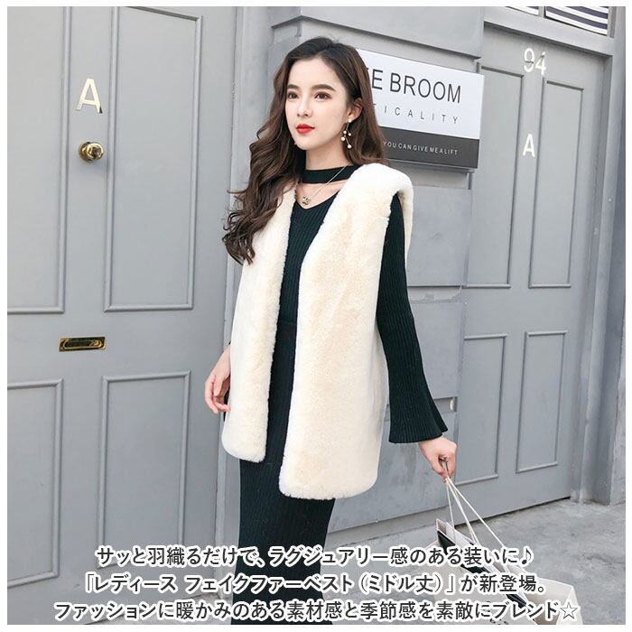 ファーベスト レディース 通販 ベスト ジレ アウター 上着 羽織り ファー フェイクファー ミドル丈 前開き ノーカラー 柔らかい 暖かい 通勤 通学 上品 エレガント 秋 冬 ジャケット ボアベスト かわいい カワイイ おしゃれ オシャレ
