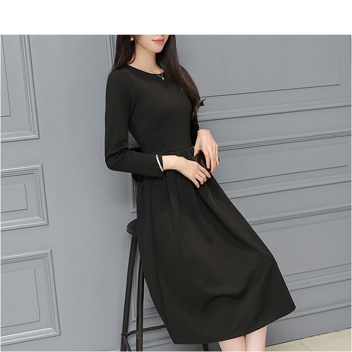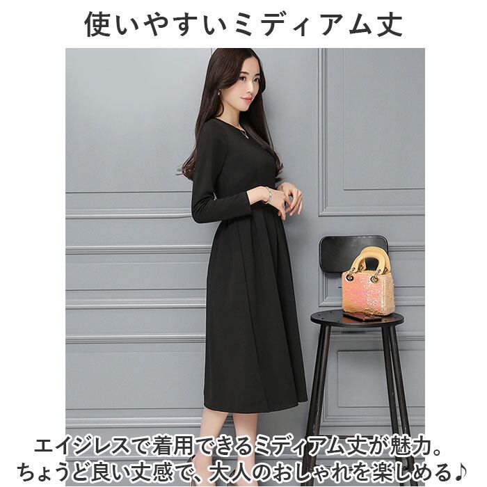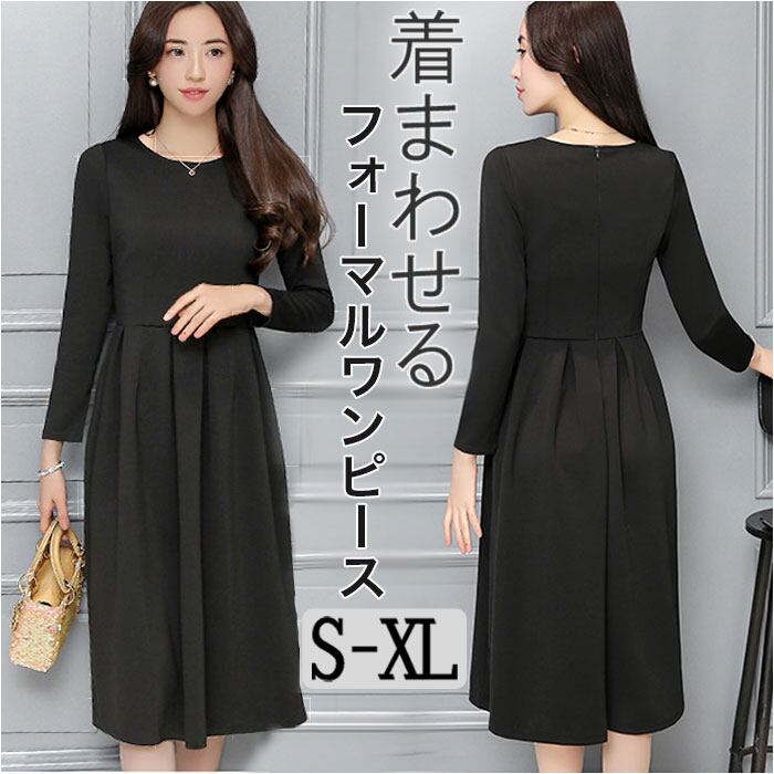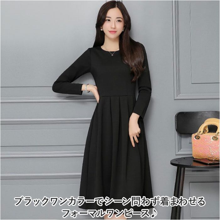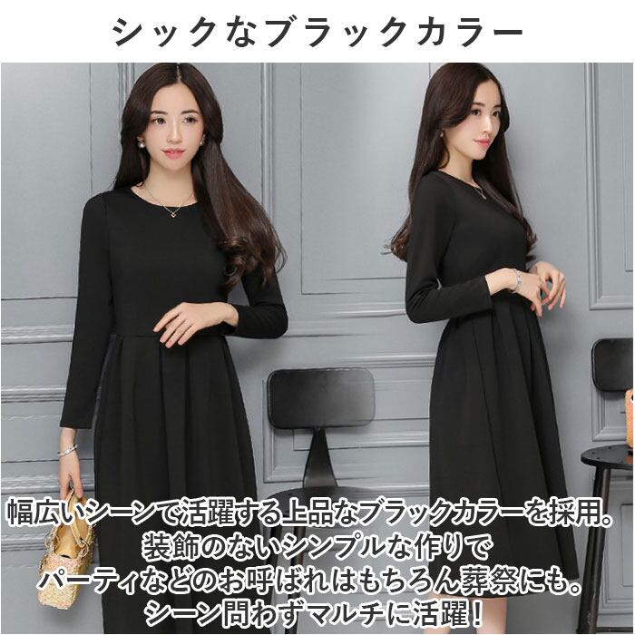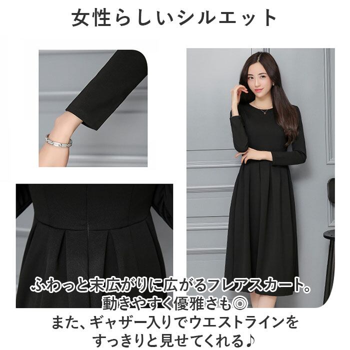 ブラックフォーマル ワンピース 通販 喪服 礼服 レディース ロング ロング丈 黒 フォーマル おしゃれ 長袖 クルーネック フレア Aライン ウエストタック きれいめ 上品 秋 冬 春 冠婚葬祭 結婚式 二次会 パーティー 演奏会 シンプル かわいい ドレス