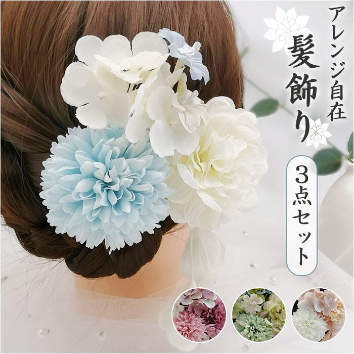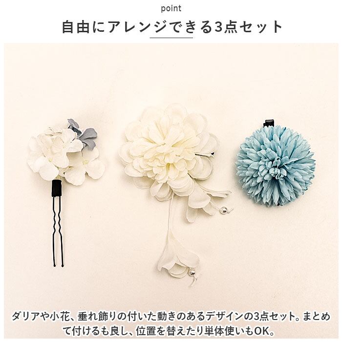 ・ダリアや小花、垂れ飾りの付いた動きのあるデザインの3点セット。まとめて付けるも良し、位置を替えたり単体使いもOK。