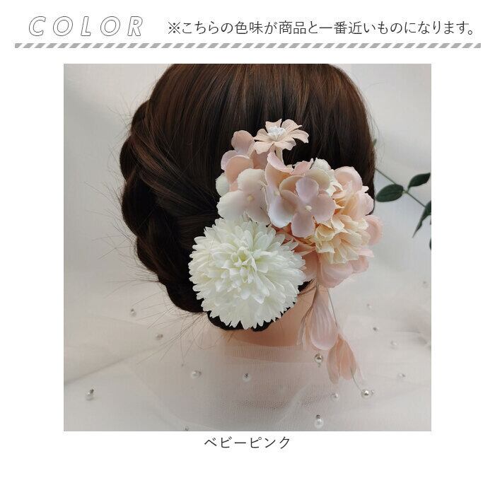 ・ダリアと垂れ飾り付きはクリップ、小花はUピン仕様。どちらも手軽にセットできるのが嬉しい!クリップタイプはショートヘアにも☆