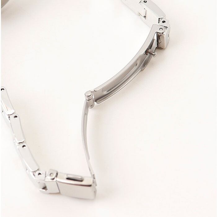 ・細めのバンドに、角度に合わせて輝く白蝶貝の文字盤。手元を華奢に、上品に演出。