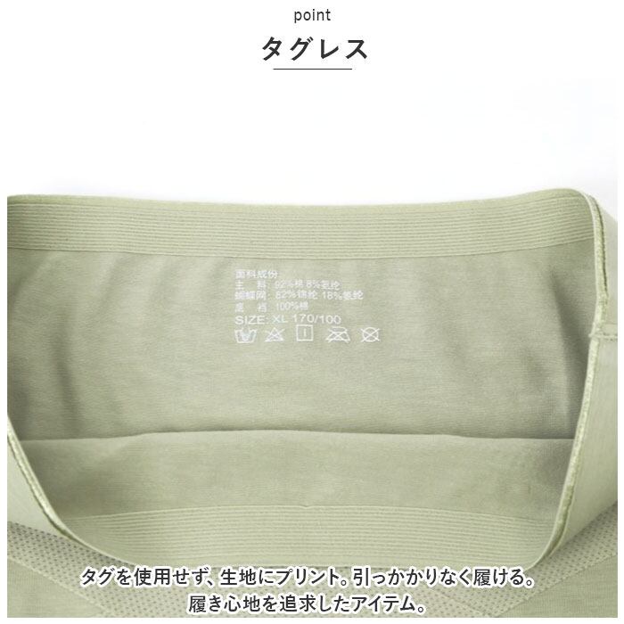 ・タグを使用せず、生地にプリント。引っかかりなく履ける。履き心地を追求したアイテム。