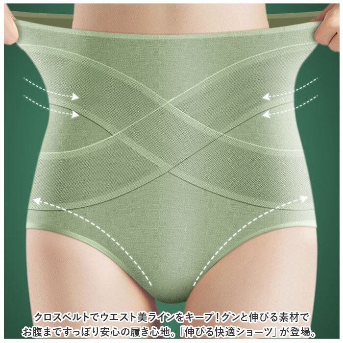 ・クロスベルトでウエスト美ラインをキープ!グンと伸びる素材でお腹まですっぽり安心の履き心地。「伸びる快適ショーツ」が登場。