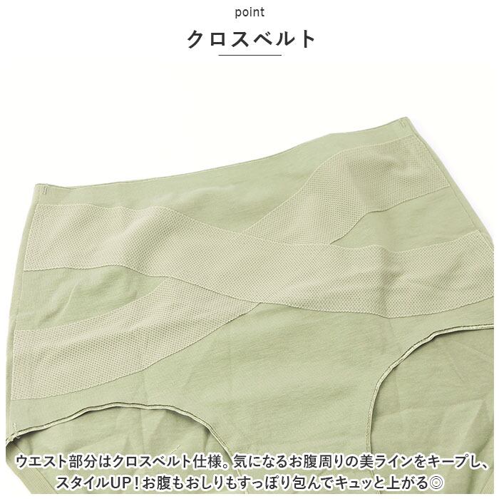 ・ウエスト部分はクロスベルト仕様。気になるお腹周りの美ラインをキープし、スタイルUP!お腹もおしりもすっぽり包んでキュッと上がる◎