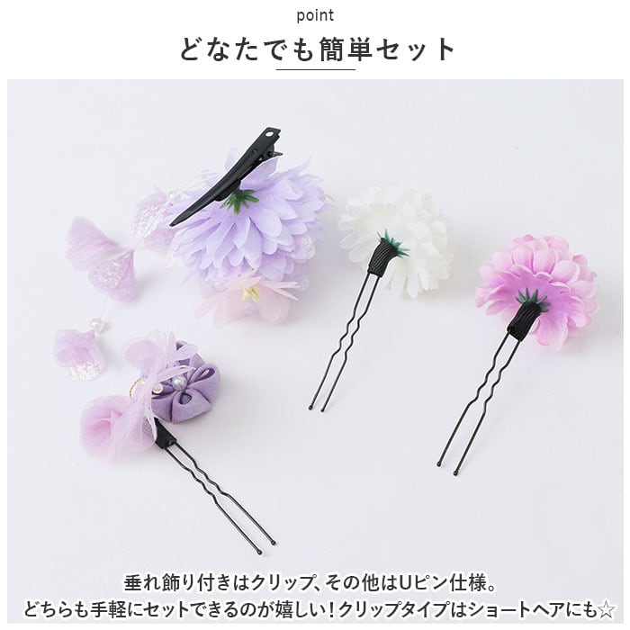 ・垂れ飾り付きはクリップ、その他はUピン仕様。どちらも手軽にセットできるのが嬉しい!クリップタイプはショートヘアにも☆