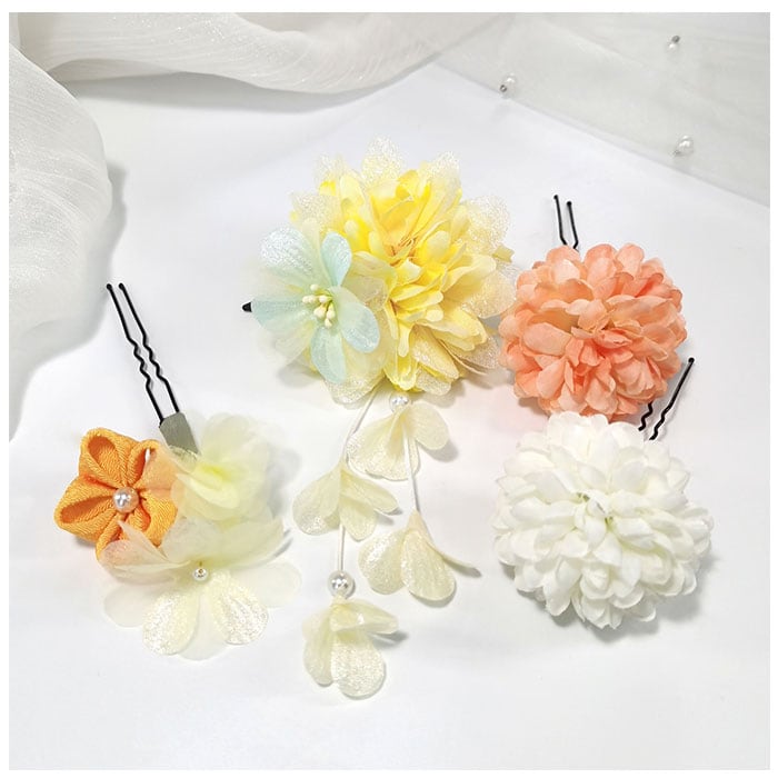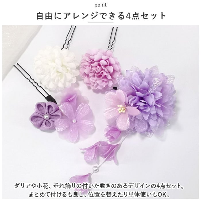 ・ダリアや小花、垂れ飾りの付いた動きのあるデザインの4点セット。まとめて付けるも良し、位置を替えたり単体使いもOK。