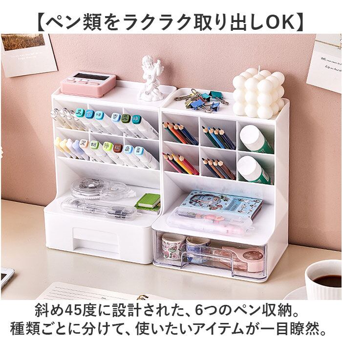 ・斜め45度に設計された、6つのペン収納。種類ごとに分けて、使いたいアイテムが一目瞭然。