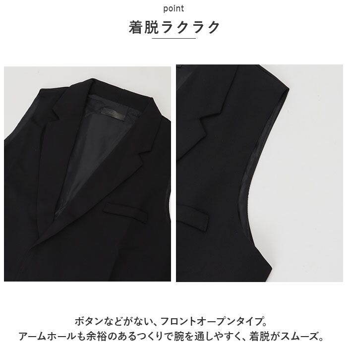 ・ボタンなどがない、フロントオープンタイプ。アームホールも余裕のあるつくりで腕を通しやすく、着脱がスムーズ。