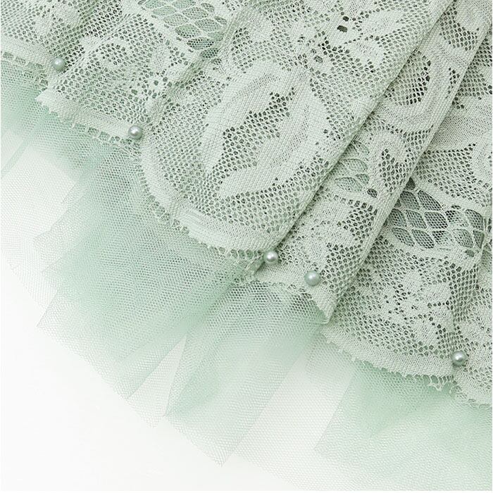 ・繊細なレース素材を重ね、大人な着こなしからフェミニンな印象まで楽しめる1着。ボトムにキラリと光るビジューがアクセント。
