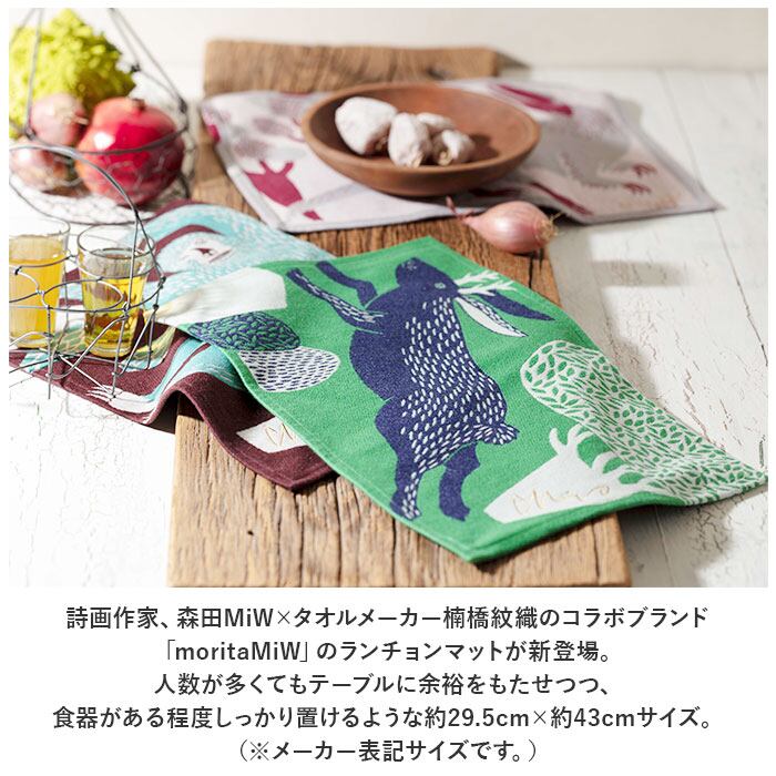 ・詩画作家、森田MiW×タオルメーカー楠橋紋織のコラボブランド「moritaMiW」のランチョンマットが新登場。