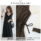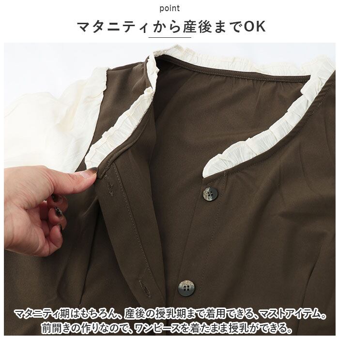・ マタニティ期はもちろん、産後の授乳期まで着用できる、マストアイテム。前開きの作りなので、ワンピースを着たまま授乳ができる。