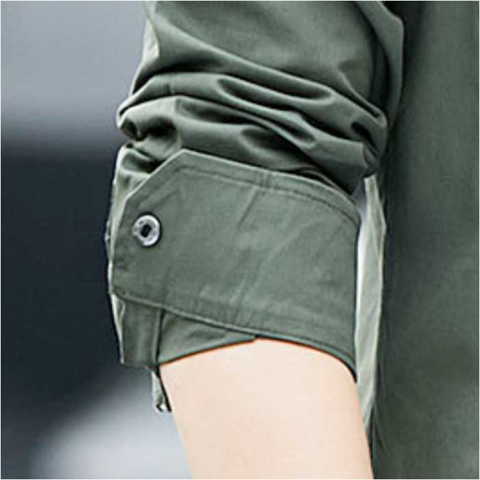・胸ポケットのエポーレット風デザインがアクセント。ミリタリー感が強すぎないのがGOOD。