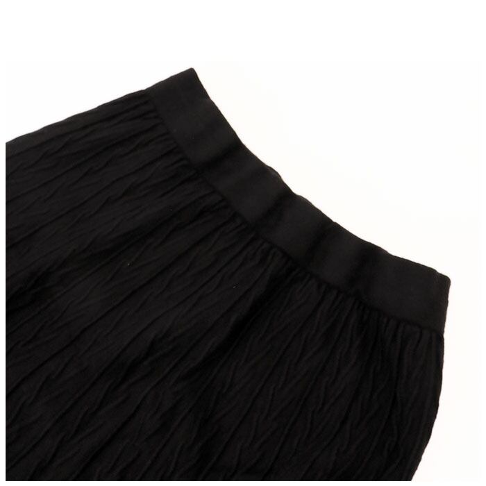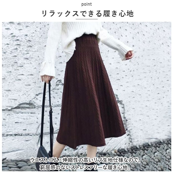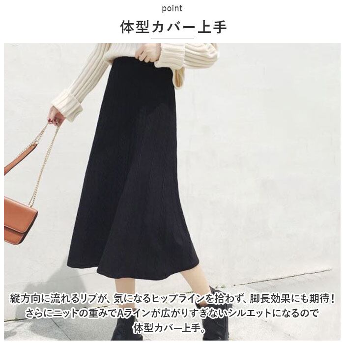 ・縦方向に流れるリブが、気になるヒップラインを拾わず、脚長効果にも期待!さらにニットの重みでAラインが広がりすぎないシルエットになるので体型カバー上手。