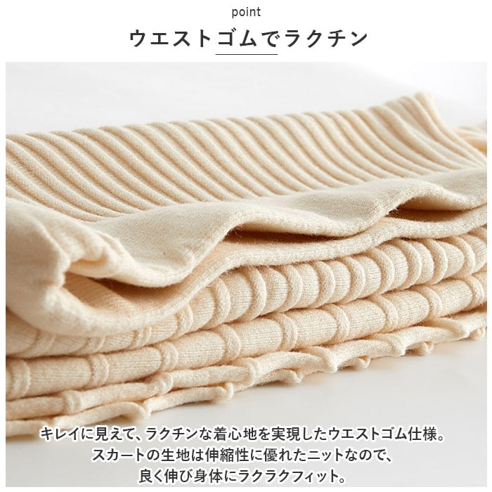 ・キレイに見えて、ラクチンな着心地を実現したウエストゴム仕様。スカートの生地は伸縮性に優れたニットなので、良く伸び身体にラクラクフィット。