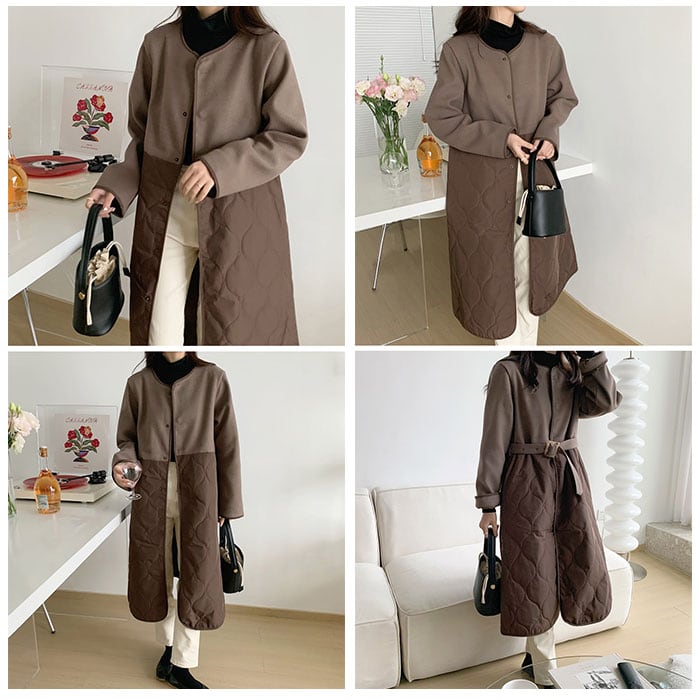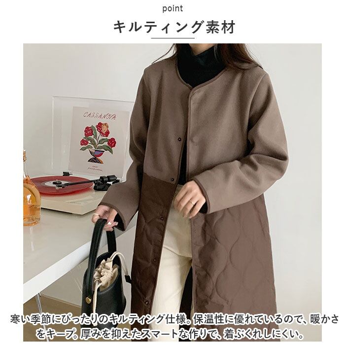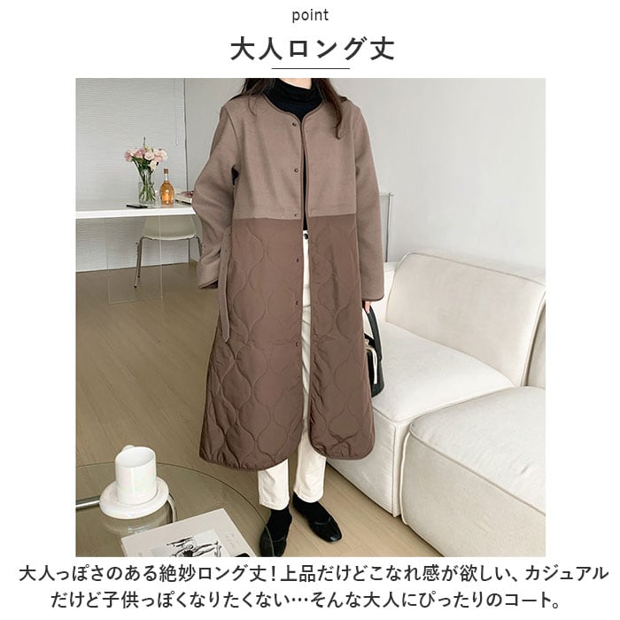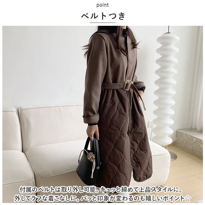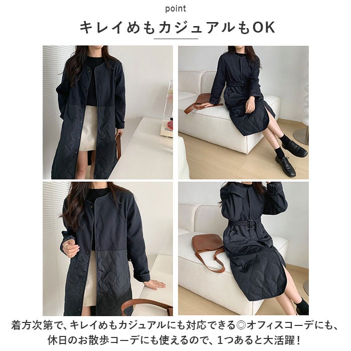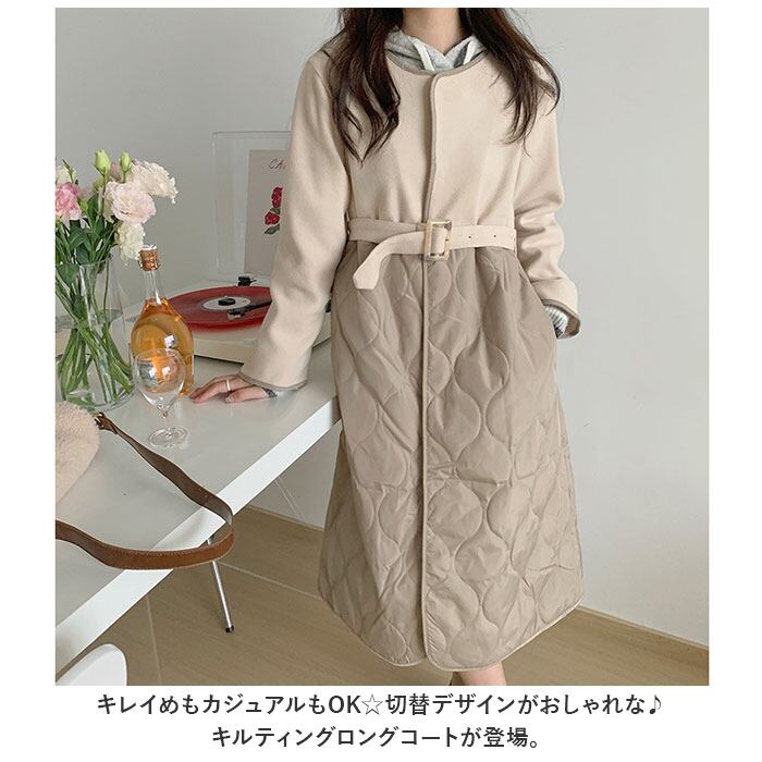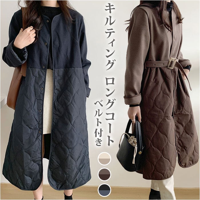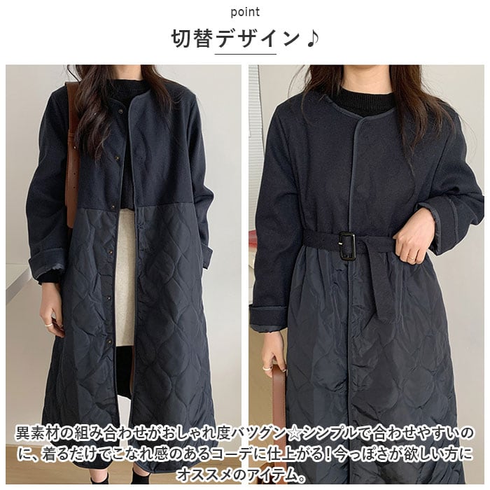 ロングコート レディース ロング丈 通販 コート アウター ジャケット 羽織り 秋 冬 かわいい おしゃれ 暖かい きれいめ 防風 防寒 ノーカラーコート キルティング 異素材切り替え ゆったり ベルト付き シンプル 無地 通勤 通学 カジュアル 上品