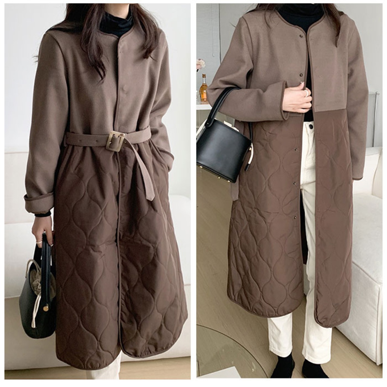 ・キレイめもカジュアルもOK☆切替デザインがおしゃれな♪キルティングロングコートが登場。