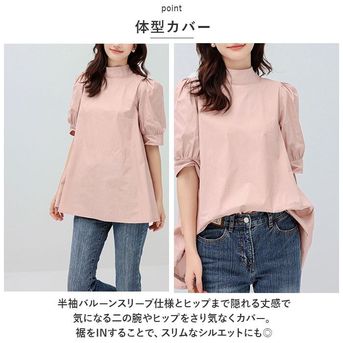 ・半袖バルーンスリーブ仕様とヒップまで隠れる丈感で、気になる二の腕やヒップをさり気なくカバー。バックの裾をINすることで、スリムなシルエットにも◎