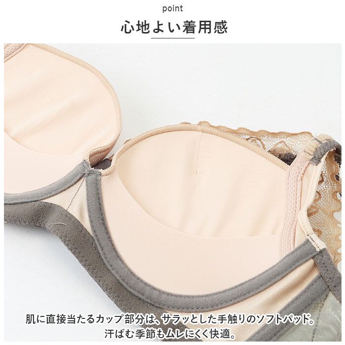 ・肌に直接当たるカップ部分は、サラッとした手触りのソフトパッド。汗ばむ季節もムレにくく快適。