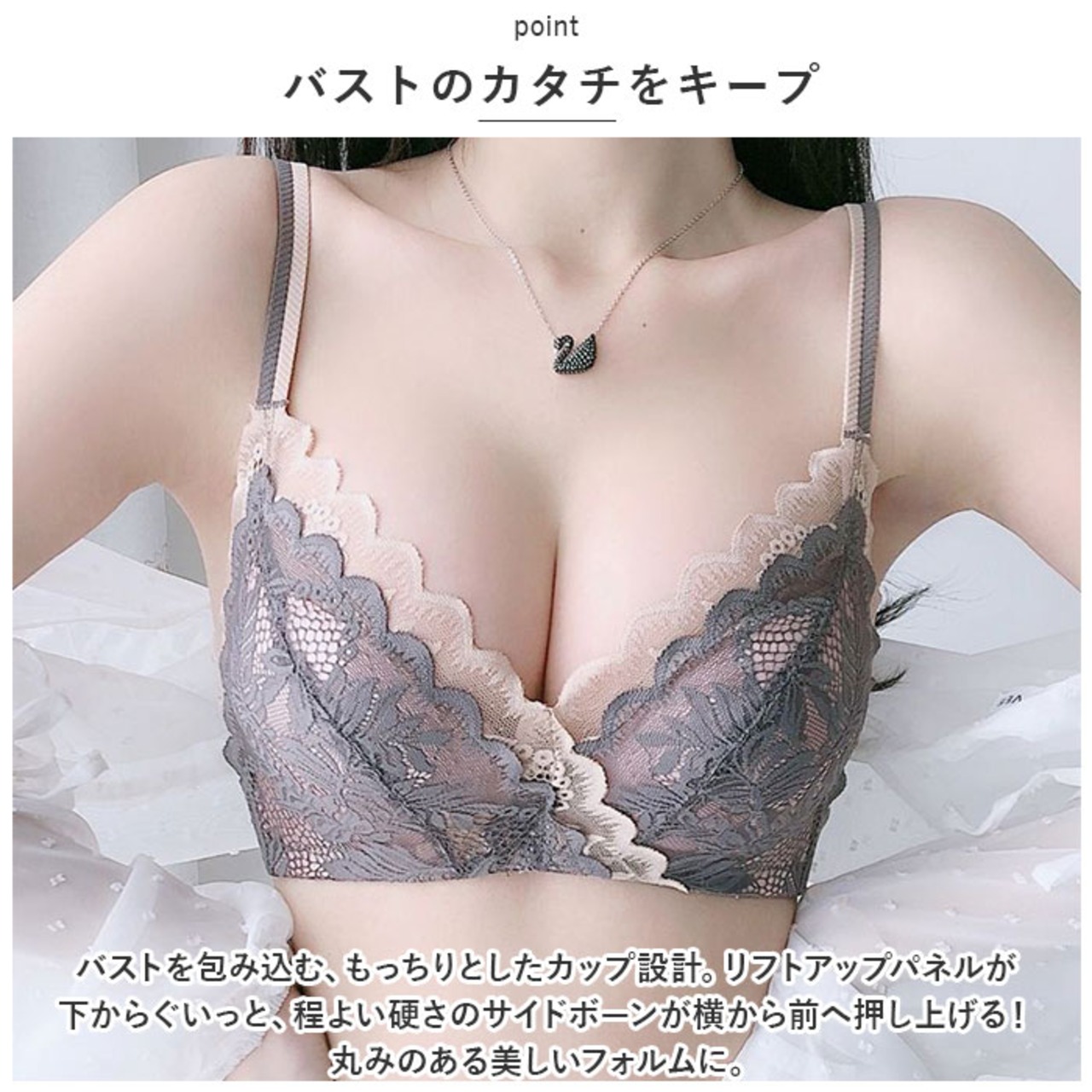 ・バストを包み込む、もっちりとしたカップ設計。リフトアップパネルが下からぐいっと、程よい硬さのサイドボーンが横から前へ押し上げる!丸みのある美しいフォルムに。