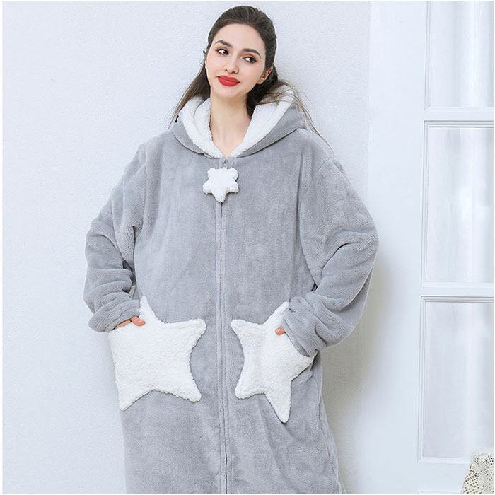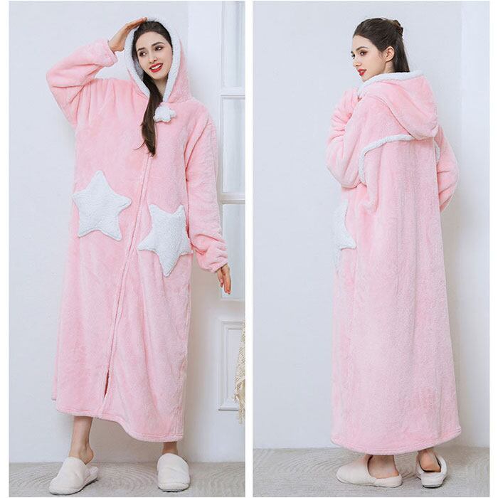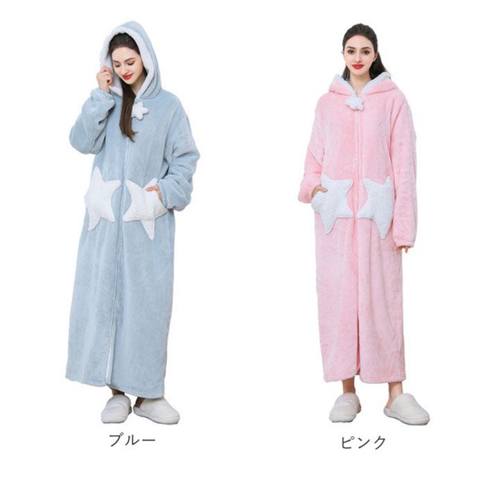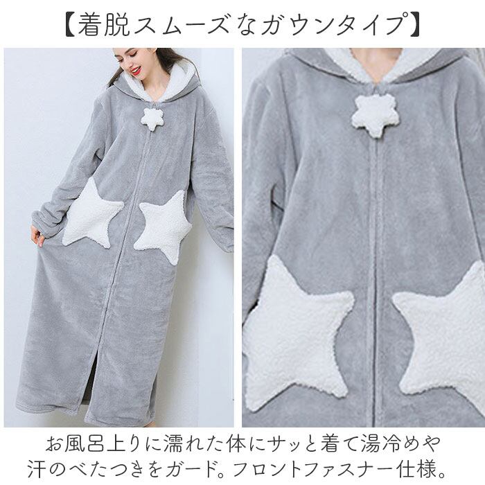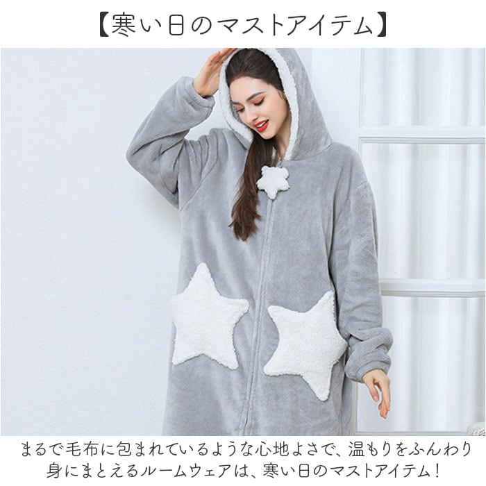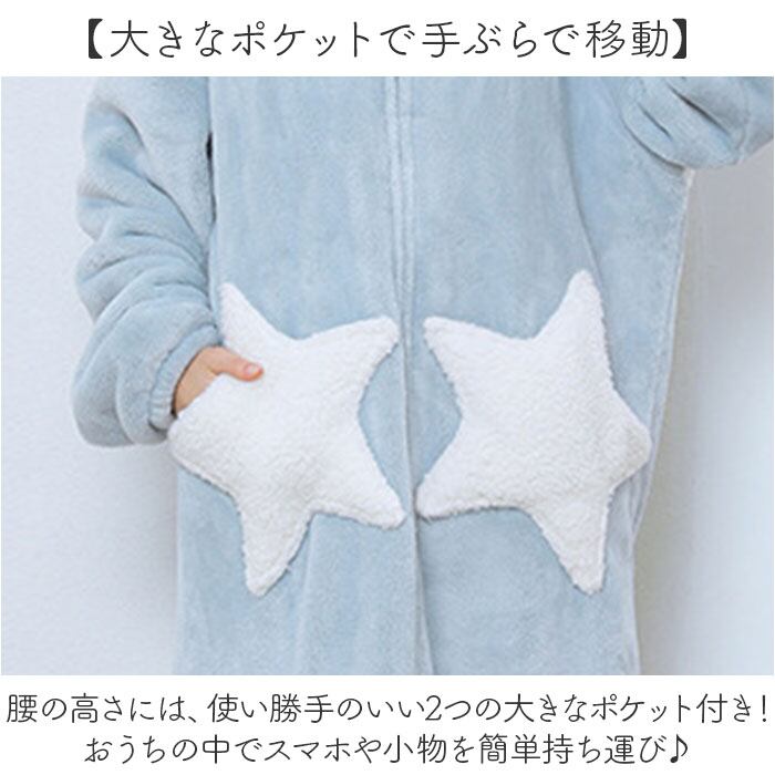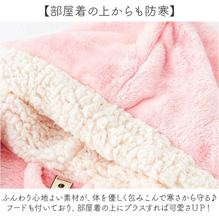 ・ふんわり心地よい素材が、体を優しく包みこんで寒さから守る♪フードも付いており、部屋着の上にプラスすれば可愛さUP!