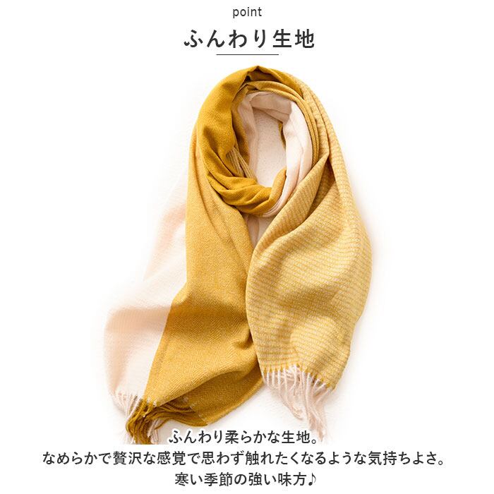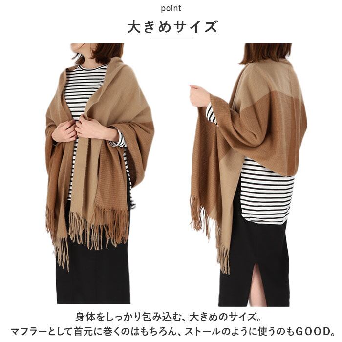 ・身体をしっかり包み込む、大きめのサイズ。マフラーとして首元に巻くのはもちろん、ストールのように使うのもGOOD。