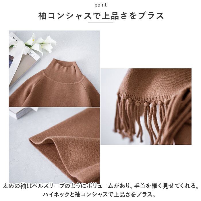 ・太めの袖はベルスリーブのようにボリュームがあり、手首を細く見せてくれる。ハイネックと袖コンシャスで上品さをプラス。