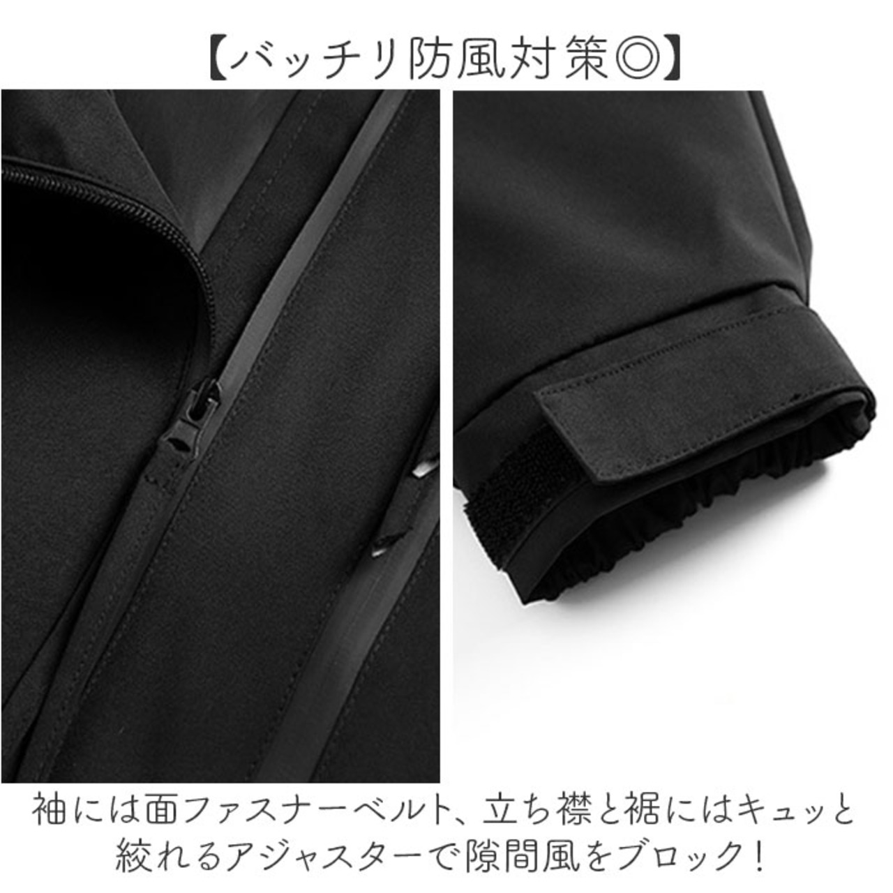 ・袖には面ファスナーベルト、立ち襟と裾にはキュッと絞れるアジャスターで隙間風をブロック!