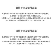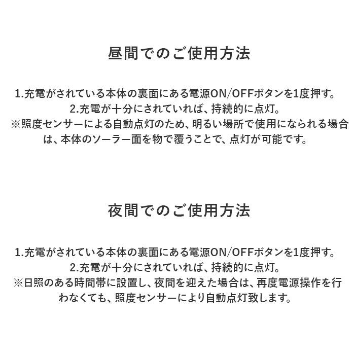 ※日照のある時間帯に設置し、夜間を迎えた場合は、再度電源操作を行わなくても、照度センサーにより、自動点灯致します。