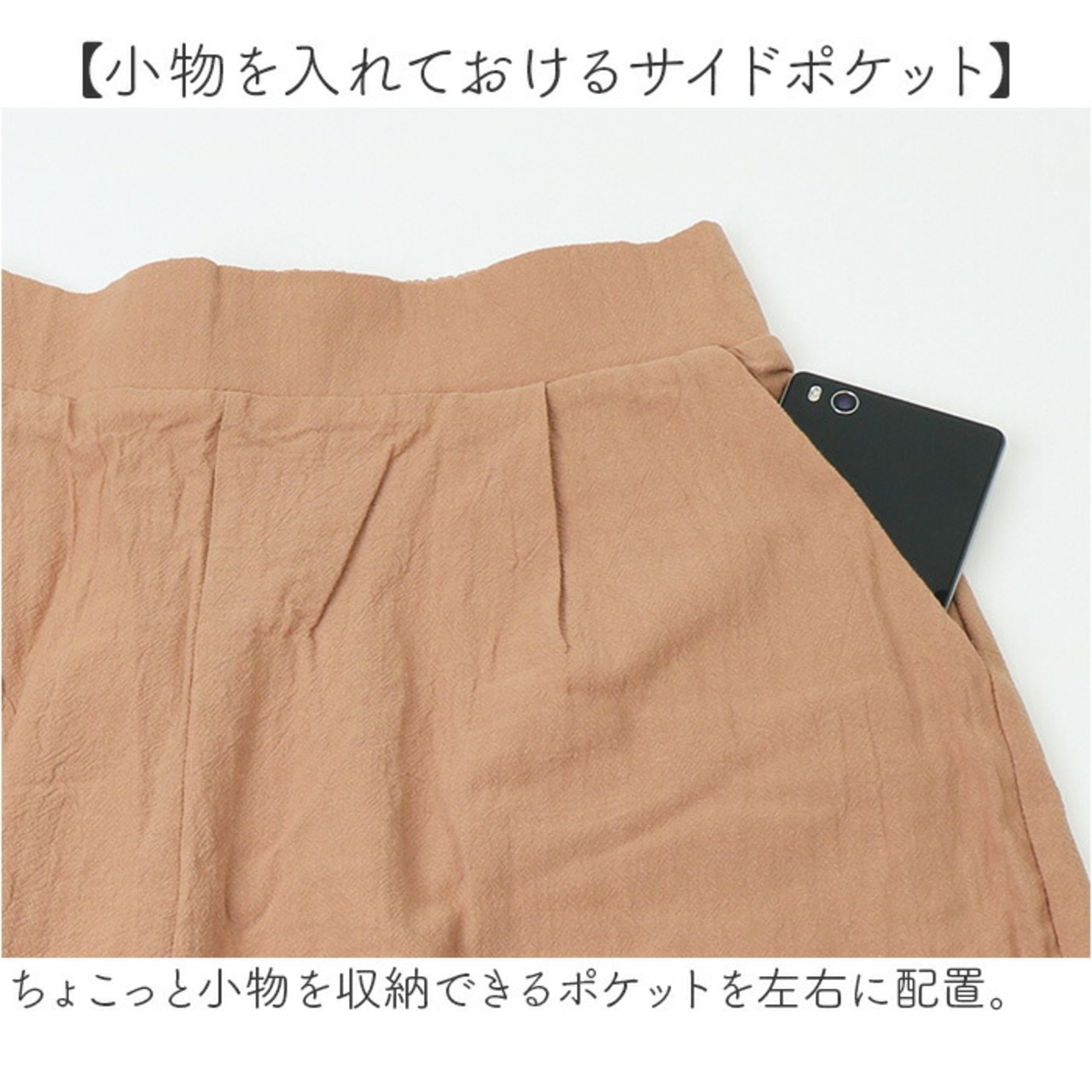 ・ウエストはバックゴムで自分サイズにフィット。フロントからの見た目はすっきり。