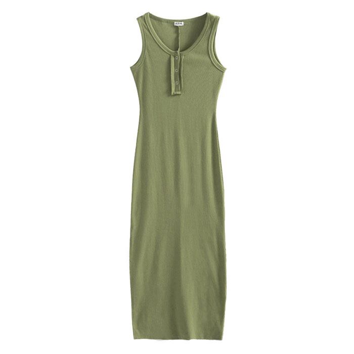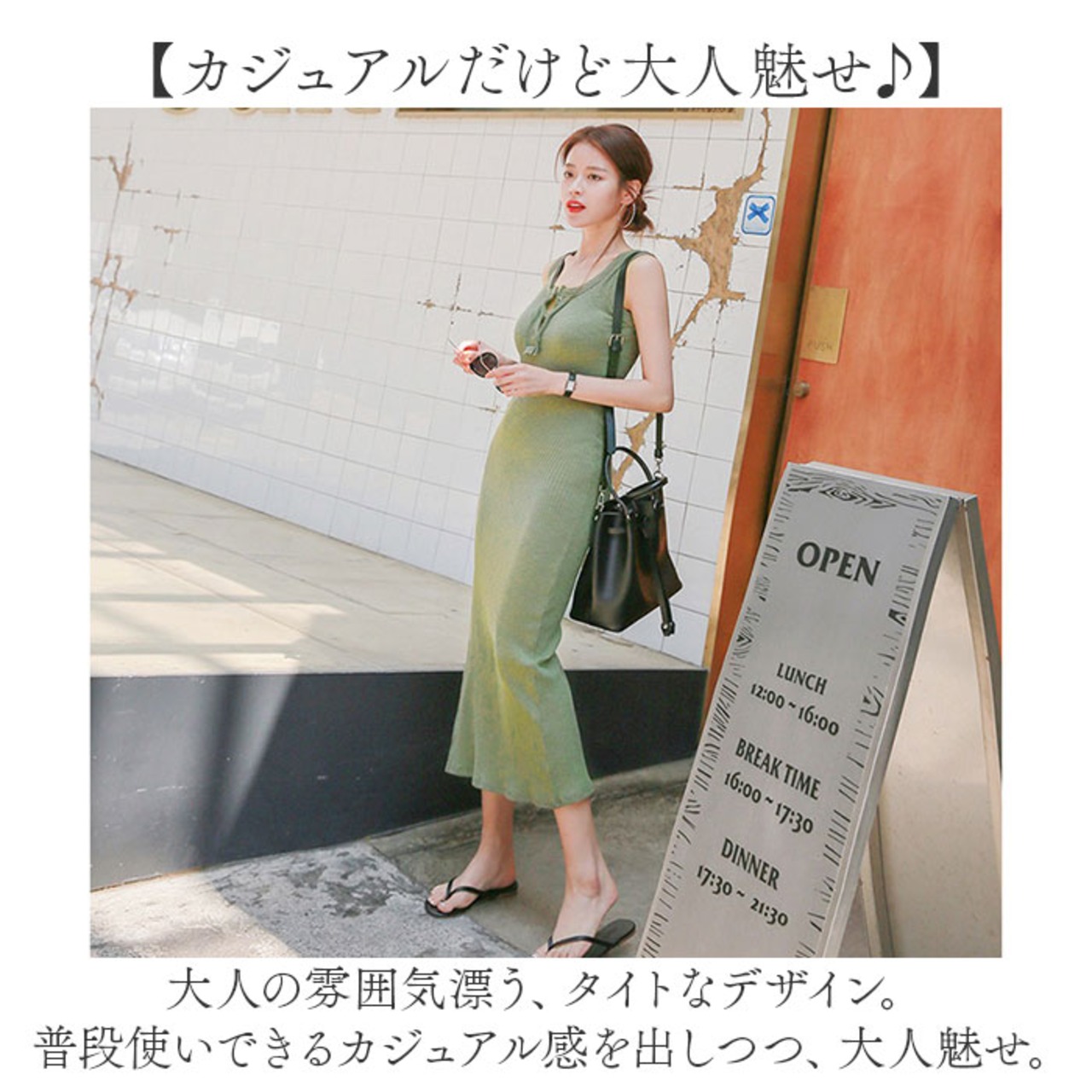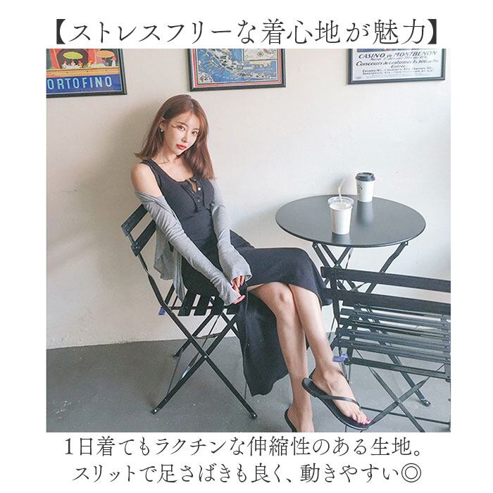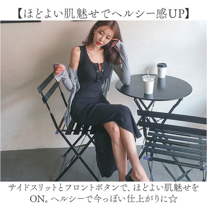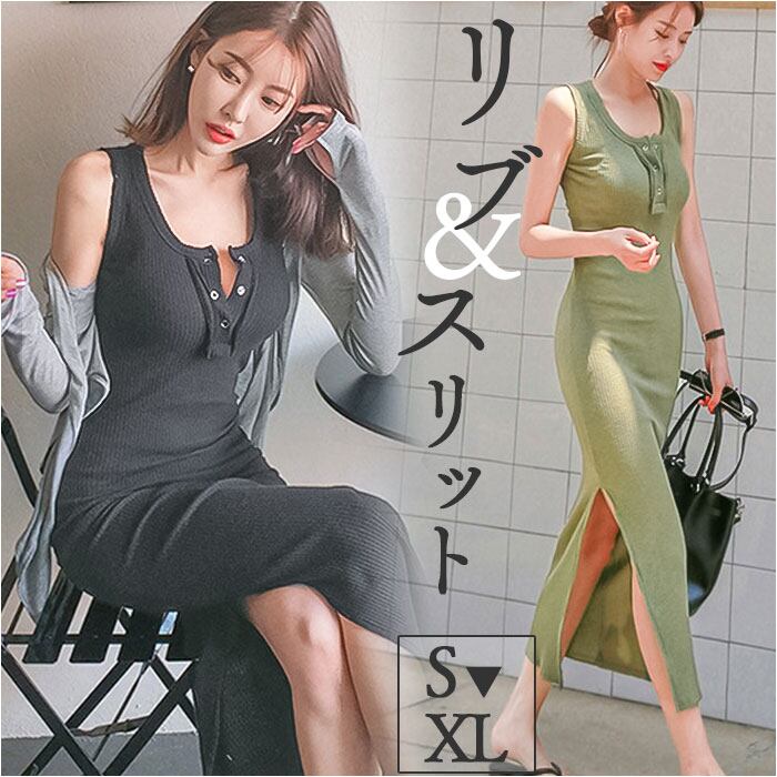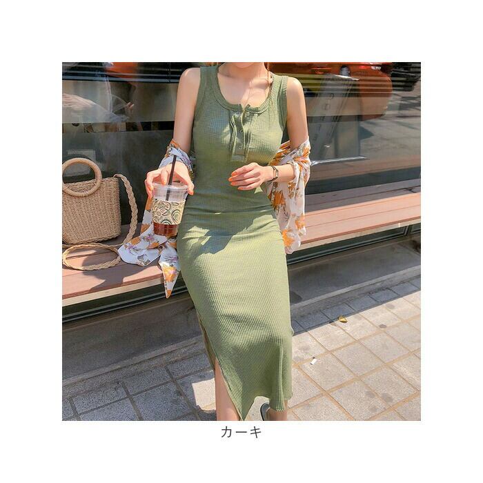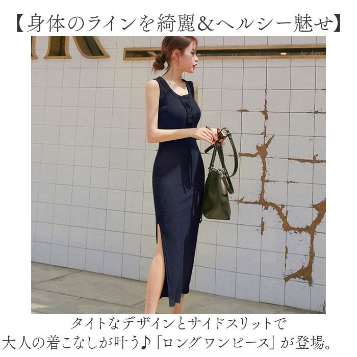 タイトワンピース 夏 ロング 通販 ロングワンピース ワンピ レディース ノースリーブ おしゃれ オシャレ きれいめ 春 ラウンドネック スリット リブ Uネック 前ボタン 柔らかい 伸縮性 薄手 シンプル 無地 通勤 通学 リゾート 旅行 かわいい
