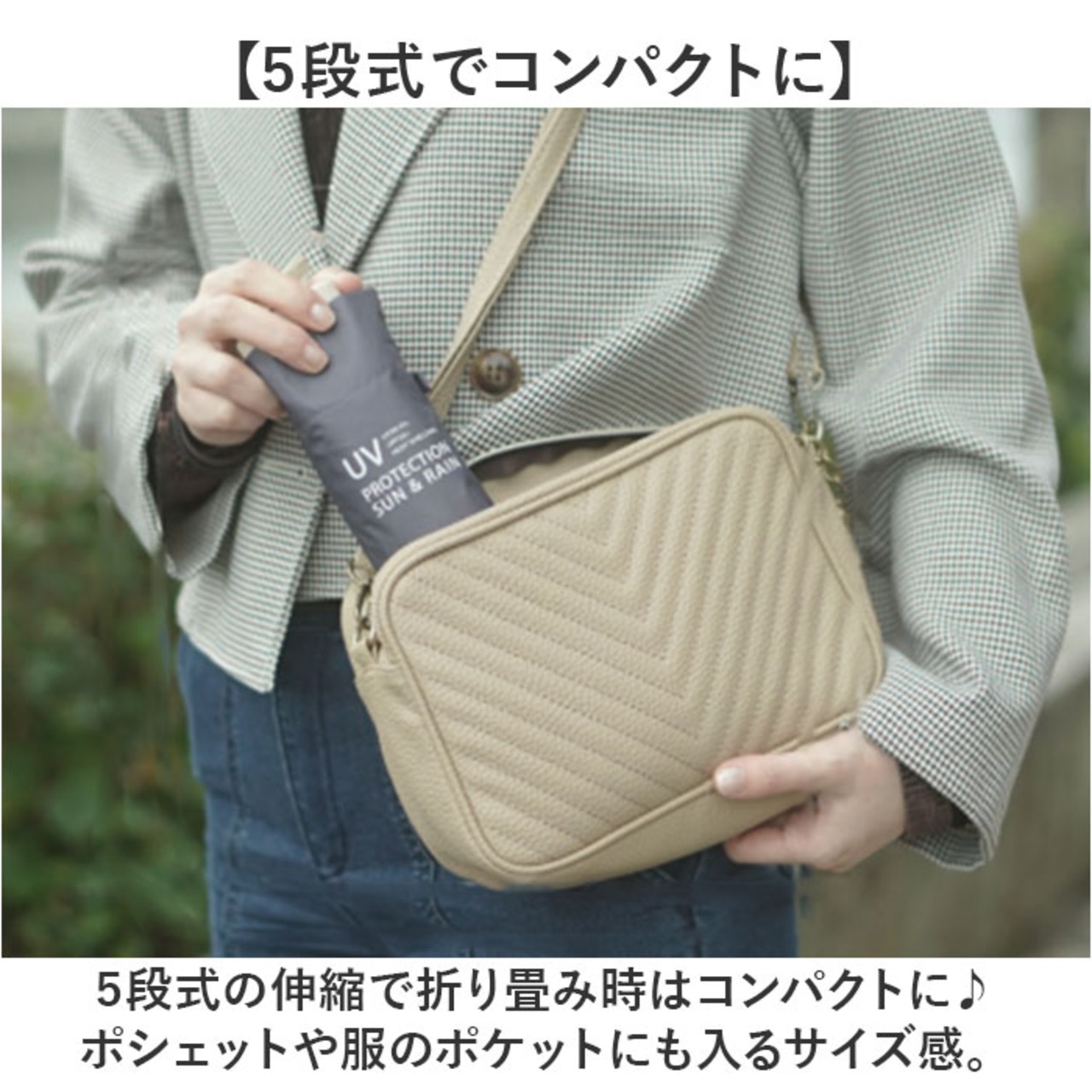 ・5段式の伸縮で折り畳み時はコンパクトに♪ポシェットや服のポケットにも入るサイズ感。