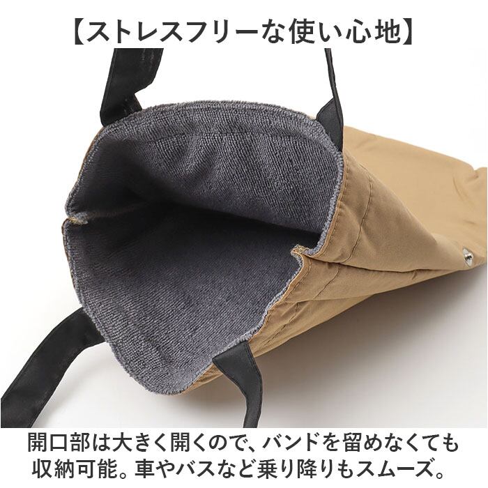 ・開口部は大きく開くので、バンドを留めなくても収納可能。車やバスなど乗り降りもスムーズ。