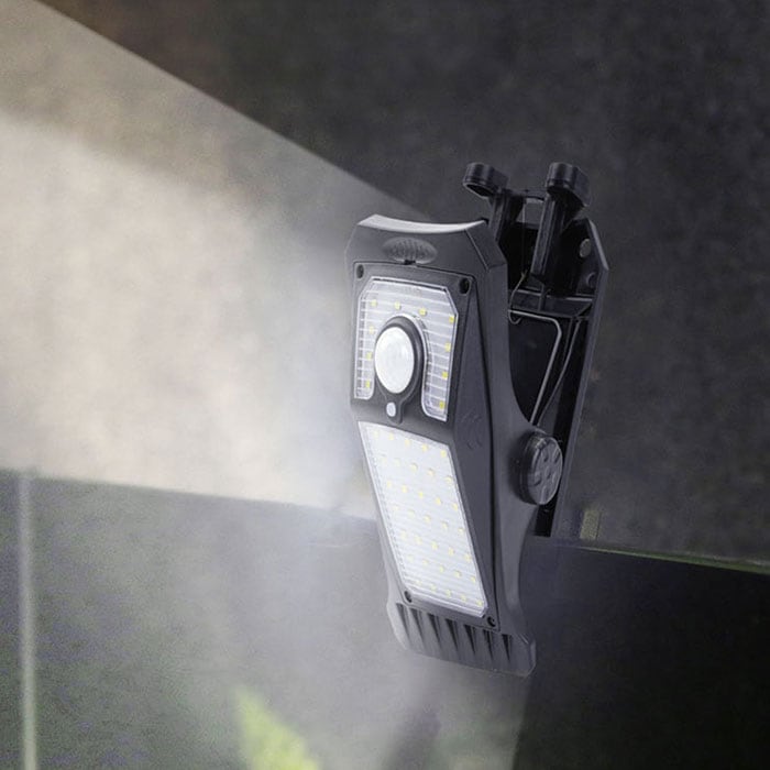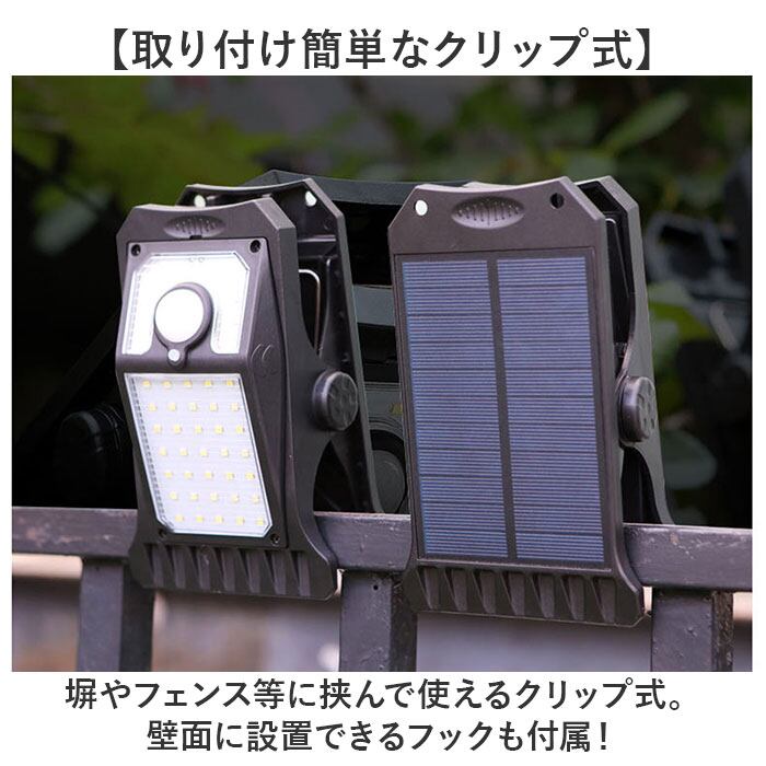 ・塀やフェンス等に挟んで使えるクリップ式。壁面に設置できるフックも付属!