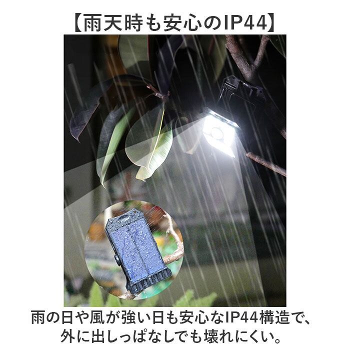 ・雨の日や風が強い日も安心なIP44構造で、外に出しっぱなしでも壊れにくい。