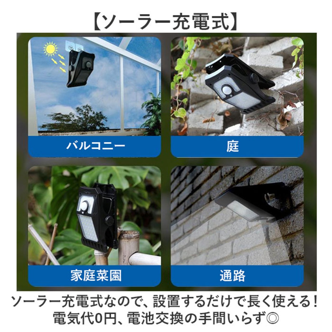 ・ソーラー充電式なので、設置するだけで長く使える!電気代0円、電池交換の手間いらず◎