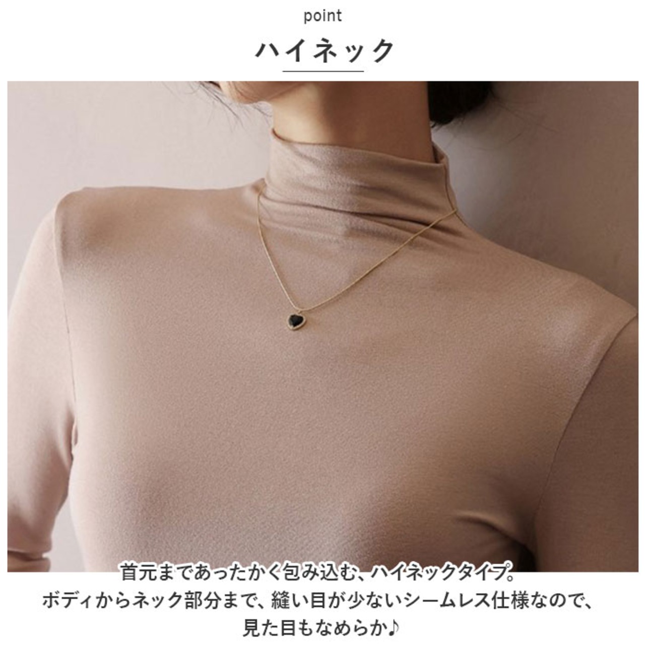 ・首元まであったかく包み込む、ハイネックタイプ。ボディからネック部分まで、縫い目が少ないシームレス仕様なので、見た目もなめらか♪