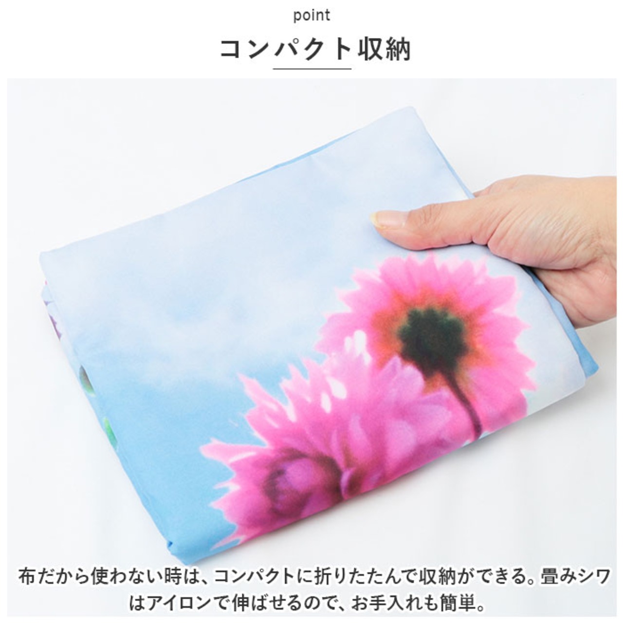 ・布だから使わない時は、コンパクトに折りたたんで収納ができる。畳みシワはアイロンで伸ばせるので、お手入れも簡単。