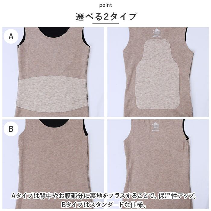 ・Aタイプは背中やお腹部分に裏地をプラスすることで、保温性アップ。Bタイプはスタンダードな仕様。